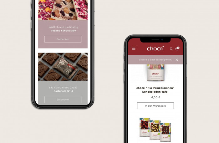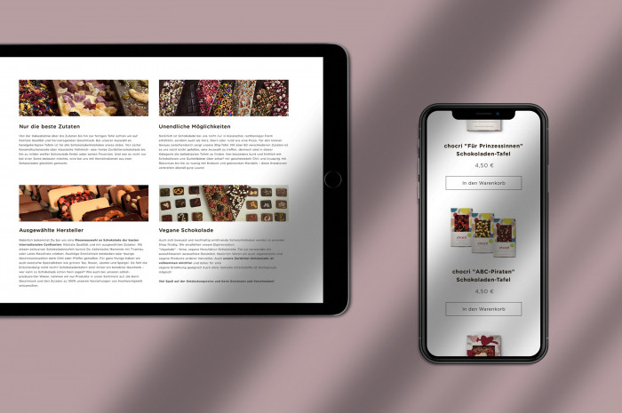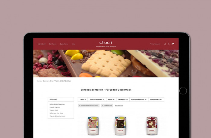 chocri produziert und vertreibt handbestreute Manufakturschokolade, die individuell gestaltet werden kann. Passend zu den verführerischen Süßigkeiten haben wir ein appetitanregendes, responsives Webdesign entwickelt und uns geschmackvolle Illustrationen dazu einfallen lassen. Das zeigt sich vor allem in dem von uns designten Magento-Onlineshop.
