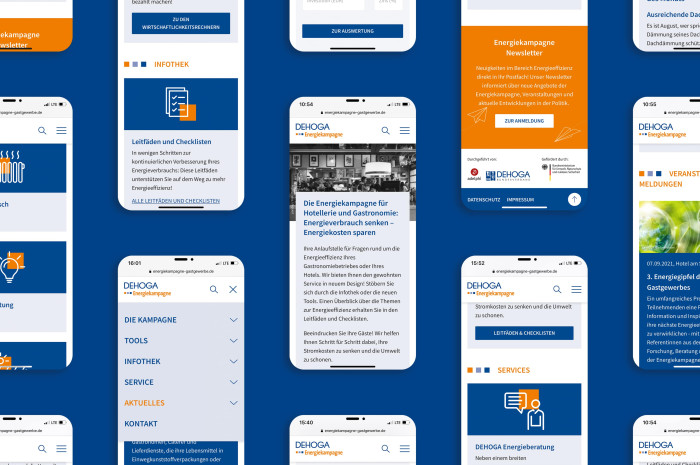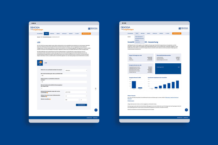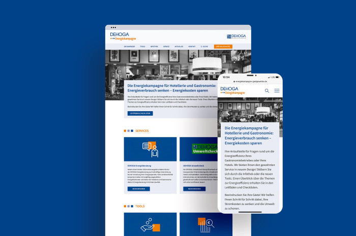 Die DEHOGA Energie- und Klimaschutzkampagne informiert den Deutschen Hotel- und Gaststättenverband und schafft damit die Grundlage für mehr Energieeffizienz im Gastgewerbe. Dabei leisten wir gerne unseren Beitrag: Auf der von uns gestalteten Kampagnenwebsite können sich die Gewerbetreibenden mit Hilfe verschiedener Tools, wie dem Wirtschaftlichkeitsrechner und der Förderdatenbank informieren und ihre Energiebilanz verbessern.