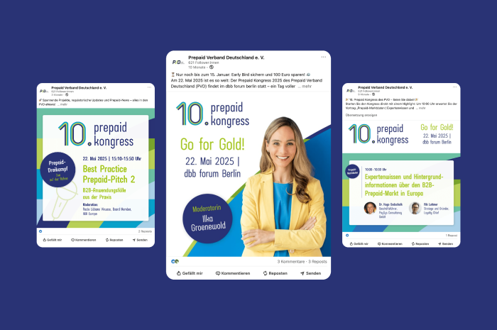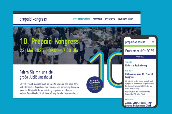 Für den vom Prepaid Verband Deutschland (PVD) ausgerichteten Prepaidkongress 2025 durften wir das komplette Erscheinungsbild gestalten – von der Entwicklung des Jubiläumslogos über das Veranstaltungsdesign bis hin zum digitalen Auftritt. So entstand ein stimmiges visuelles Konzept, das den Kongress auf allen Ebenen begleitet.