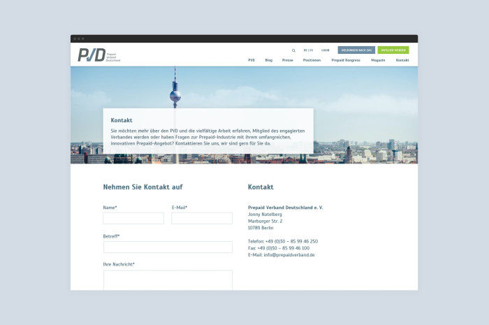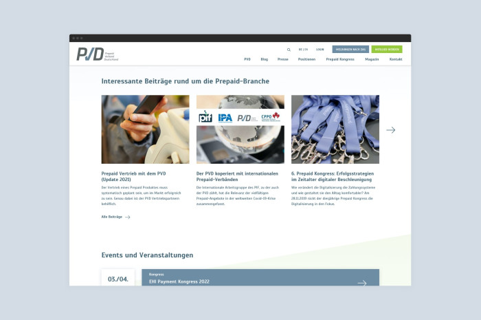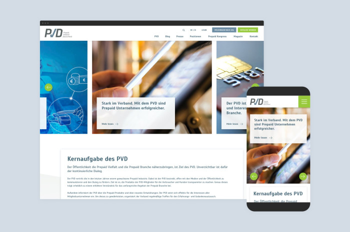 Der Prepaid Verband Deutschland (PVD) vertritt die Prepaid-Industrie. Ziel ist dabei, offen mit den Medien und der Öffentlichkeit zu kommunizieren und die Produkte der PVD-Mitglieder transparenter zu machen. Für die Onlinepräsenz des Verbandes haben wir ein zeitgemäßes Webdesign entwickelt.